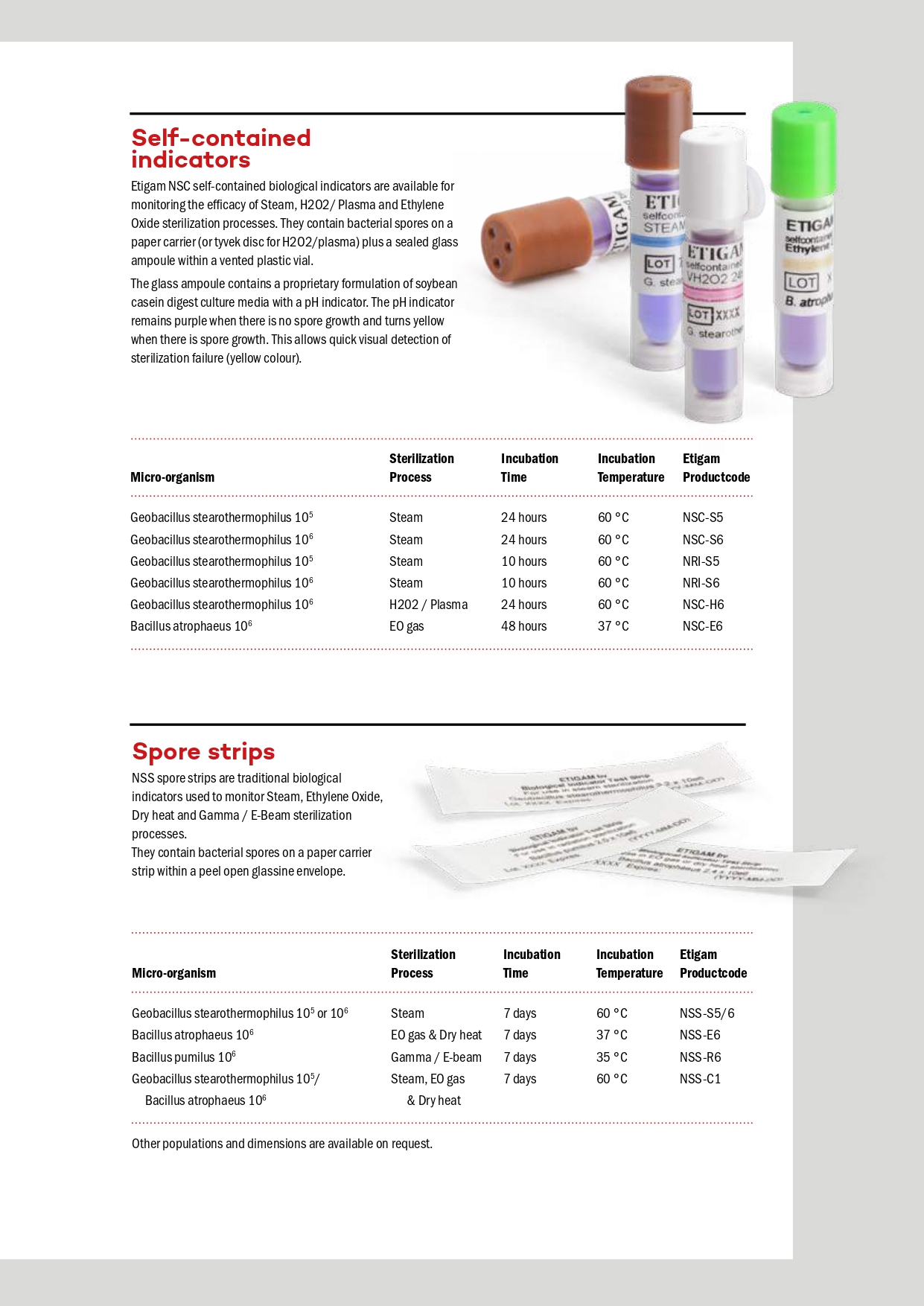 Biological steam indicators are carriers with spores of geobacillus stearothermophilus, as a challenge to the sterilization process. They are used for validation and routine monitoring to demonstrate the efficacy of the sterilization cycles. The indicator is exposed to the process and then incubated under defined growth conditions to determine whether any spores survived the process. If no spores survive, none grow and the cycle is a pass. If growth is detected, it is a fail. All Etigam biological indicators rely on true and full microbial growth. A dedicated reader is not required, the result can be visually verified (by colour-change or turbidity).
