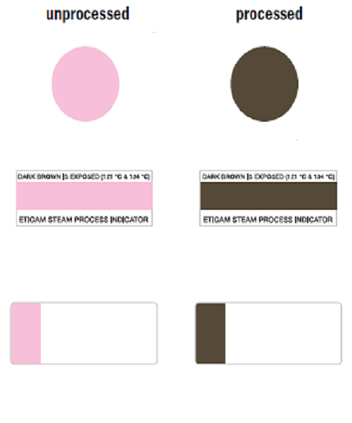 Chemical steam indicators can be used in steam sterilization processes. They show a significant colour change from pink (unexposed) to dark brown, when exposed to steam. Chemical steam indicators are designed for use in steam autoclaves operating at 121 °C / 1 bar or 134 °C / 2 bar. The colour change of the indicators is dose dependent. The indicators are meant to be used on individual items that need to be sterilized. The indicators can be supplied as single dots, squares or other shapes They can be printed or applied to larger labels that are preprinted or customized with text or company logo.